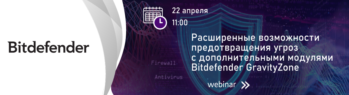 На вебинаре поговорим о том, как усилить защиту безопасности вашего бизнеса с помощью дополнительных модулей защиты Bitdefender.
