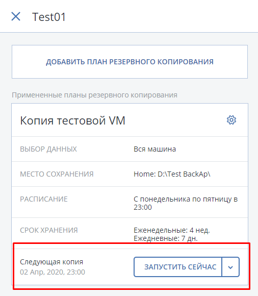 После создания плана резервного копирования из этой же панели можно принудительно запустить процесс