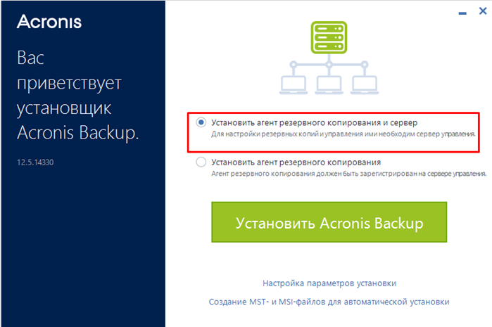 Первым делом необходимо установить управляющий сервер. Для этого загружаем инсталлятор с сайта Acronis, запускаем его и соглашаемся с лицензионным соглашением. Также можно изменить язык установки, например, на русский.