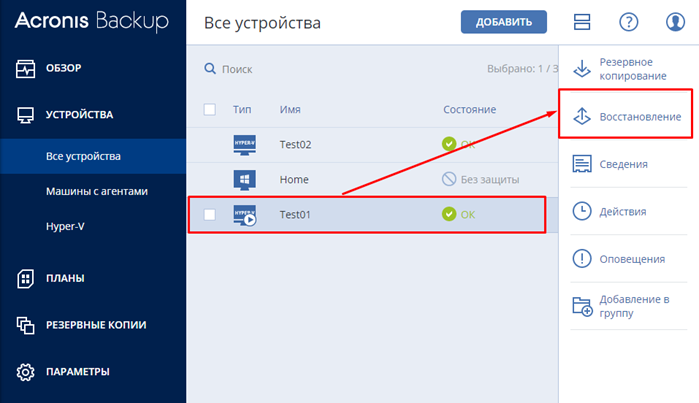 Есть три варианта восстановления «Вся машина», «Файлы и папки» «Запустить ка ВМ»