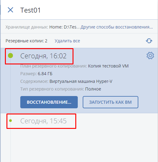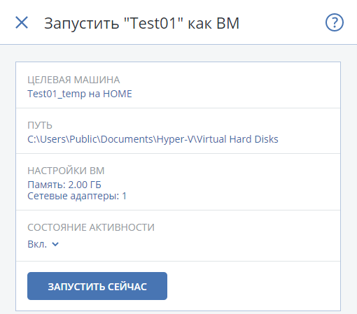 Запустить как ВМ – восстановить нужное состояние машины как виртуальную машину на нужном хостовом сервере. Нужно будет указать место расположение файлов восстанавливаемой виртуальной машины. Машина после восстановления находится в выключенном состоянии.