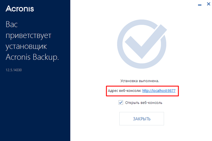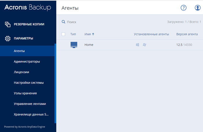 Управление Acronis через веб панель. После установки нас перебрасывает в веб консоль автоматически