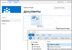 • Перетащите файлы в библиотеку SharePoint, где написано “перетащите файлы сюда”. Когда файл находится над библиотекой, в ней должна появиться надпись “Перетащите сюда”.