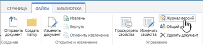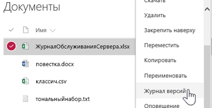 В версиях SharePoint Server щелкните многоточие (…) рядом с именем файла, а затем щелкните многоточие (…) в диалоговом окне, чтобы открыть меню, или выберите документ и на вкладке Файлы щелкните Журнал версий.
