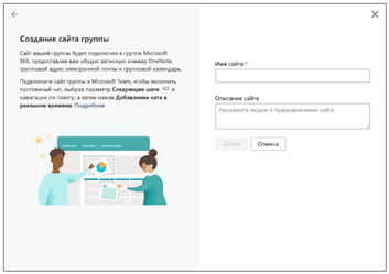 Если вы используете Microsoft 365, можно создать сайт на начальной странице SharePoint и автоматически создать группу Microsoft 365. Если создать группу Microsoft 365 в Outlook или в представлении “Люди”, автоматически будет создан сайт группы в SharePoint в Microsoft 365.