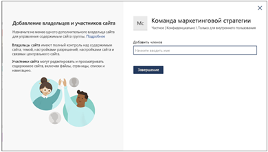 10) При использовании SharePoint в Microsoft 365 в поле Добавить участников добавьте имена или адреса электронной почты для всех, кого вы хотите назначить участниками сайта, а затем нажмите Готово. Участники, добавленные в группу Microsoft 365, связанные с сайтом, автоматически добавляются в группу участников сайта.