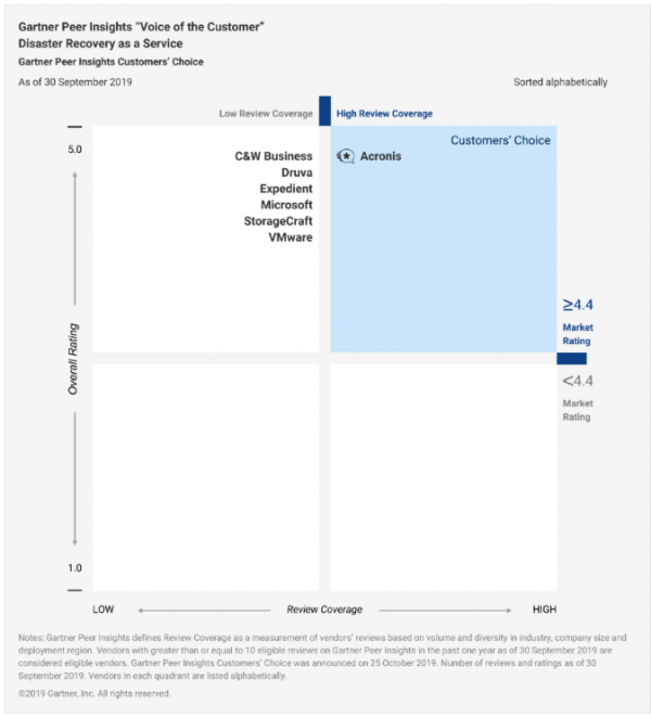На рынке DRaaS компания Gartner Peer Insights опубликовала 378 обзоров и рейтингов за период в 12 месяцев, заканчивающийся 30 сентября 2019 года. Имея 80 обзоров с общим рейтингом 4,5 из 5 звезд, Acronis получил в октябре 2019 года статус «Выбор клиентов» Acronis Disaster Recovery в качестве услуг.