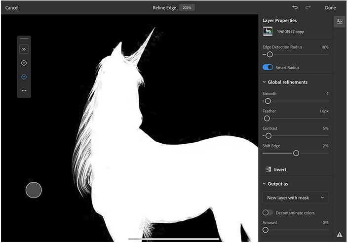 Кисть «Refine Edge» – один из самых важных инструментов выделения в Photoshop. Он используется для мягкого выделения краев на сложных объектах, таких как волосы и мех, или для идеального выбора объектов, которые смешивают мягкие и твердые края, а также во многих других сложных операциях выбора. Adobe представит этот инструмент на iPad в следующем году.