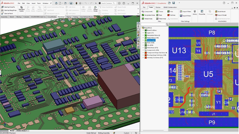 Совместная работа в ECAD-MCAD при проектировании печатных плат была улучшена для проектировщиков электрооборудования и механики благодаря новым возможностям CircuitWorks. Эта надстройка к SOLIDWORKS обеспечивает двустороннюю совместную работу и теперь доступна всем пользователям SOLIDWORKS. Улучшена также коммуникация между участниками проекта при внесении изменений в печатные платы. Изменения могут инициироваться как MCAD, так и ECAD-проектировщиками, после чего модели легко передаются туда и обратно для рассмотрения изменений.