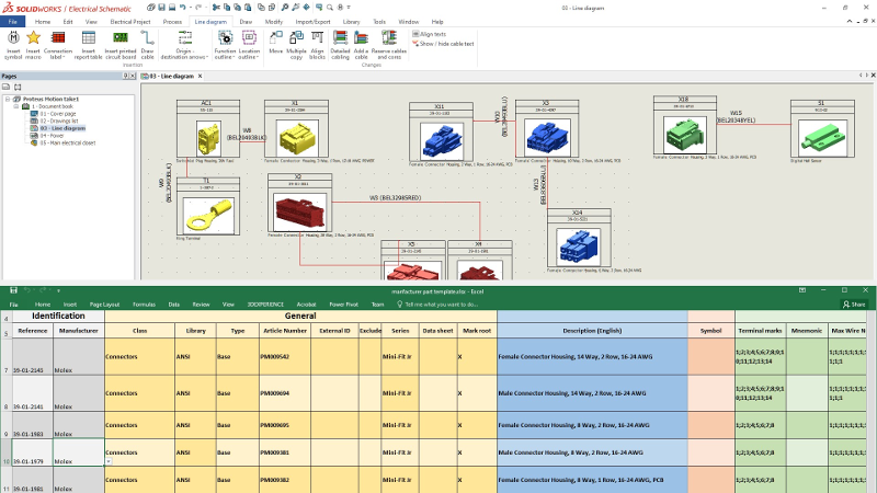 Новый инструмент для импорта электрического контента ускоряет процесс загрузки как нового, так и существующего содержимого. Вы можете импортировать информацию о цепях, клеммах и жилах кабеля, используя настраиваемый шаблон на основе Microsoft® Excel, который подходит для разных типов электрической классификации. Этот улучшенный метод позволяет гибко импортировать данные о деталях производителя в библиотеку, включая информацию о жилах кабеля и клеммах компонентов.