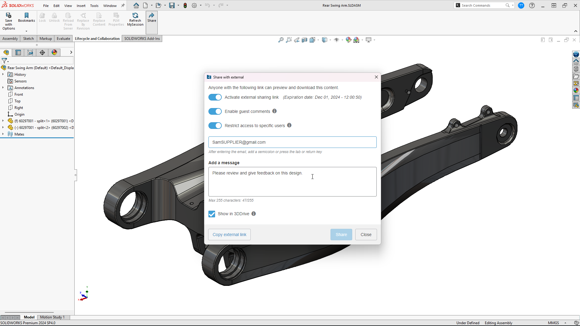 Share and Markup — это удобный инструмент, который позволяет работать в SOLIDWORKS и легко делиться 3D-дизайнами с коллегами или партнёрами, даже если у них нет SOLIDWORKS. Вы можете предоставить доступ к файлу, и ваши партнёры смогут добавлять комментарии, делать пометки и предлагать изменения. Все их правки вы сможете увидеть прямо в SOLIDWORKS.