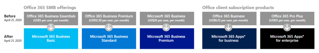 Ведущий разработчик программного обеспечения, компания Microsoft объявила об изменении названий своих подписок Office 365 для малого и среднего бизнеса (SMB) начиная с 21 апреля 2020 года. Отмечается, что в коммерческих подписках не будет изменений в цене, функциях или бизнес-модели.