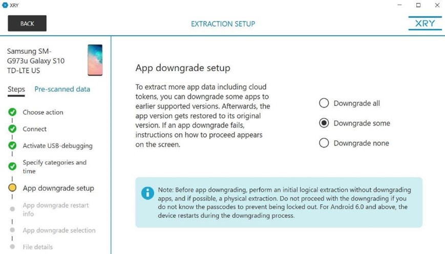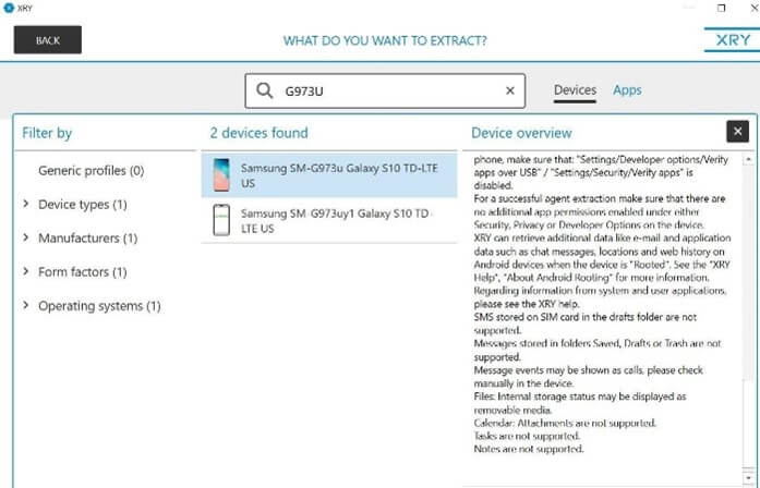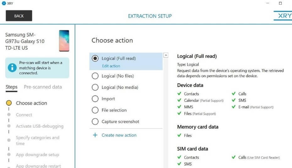 Предварительное извлечение данных из Samsung Galaxy S10 было простым и интуитивно понятным. После ввода модели мобильного устройства в XRY, пользователю отображается список устройств, которые поддерживает решение и доступные для извлечения данные.