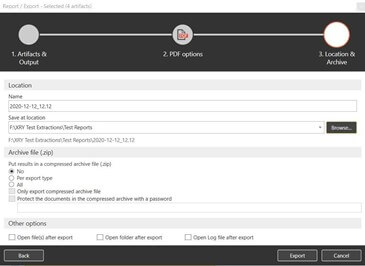 Дополнительные функции, касающиеся конкретного места хранения и встроенной возможности архивирования отчета и сопроводительных файлов, также доступны в процессе генерации отчетов, как в данном примере для генерации отчетов в формате PDF: