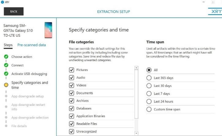 Одной из самых полезных функций XRY для IT-специалистов и правоохранительных органов является возможность менять продолжительность извлечения данных или выбрать нужные области, например изображения или видео.