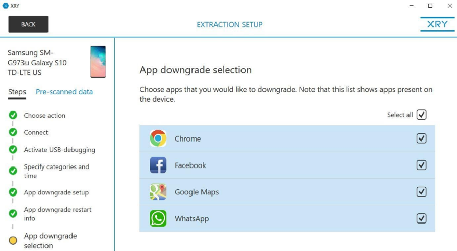 При извлечении данных XRY позволяет выбрать все или некоторые из доступных приложений для понижения их версий. Эта опция будет полезной, если нужные данные сохранены только в одном приложении.