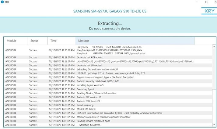Пользователь может отслеживать, какие шаги предпринимались XRY и как проходил сам процесс извлечения данных.