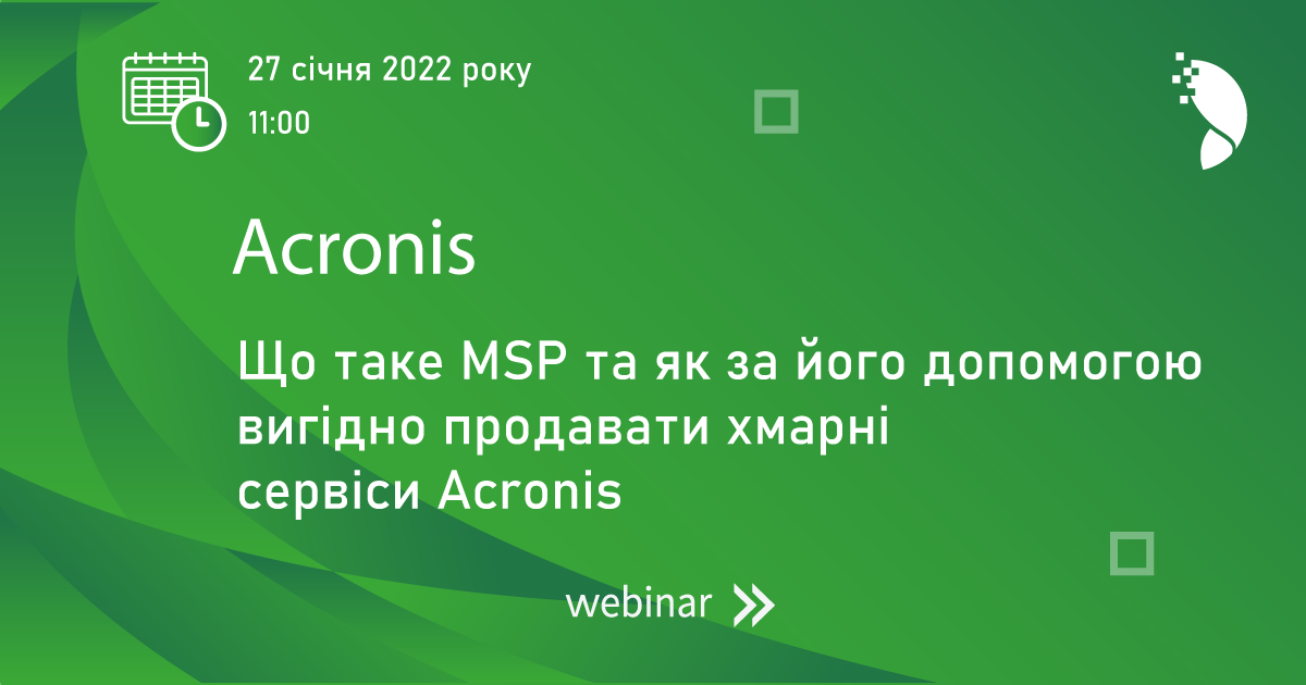 Yuliia Skladaniuk2022-01-17T11:40:56+03:0027/01 | Вебінар “Що таке MSP та як за його допомогою вигідно продавати хмарні сервіси Acronis”Yuliia Skladaniuk2022-01-17T11:40:56+03:00Січень 14, 2022|