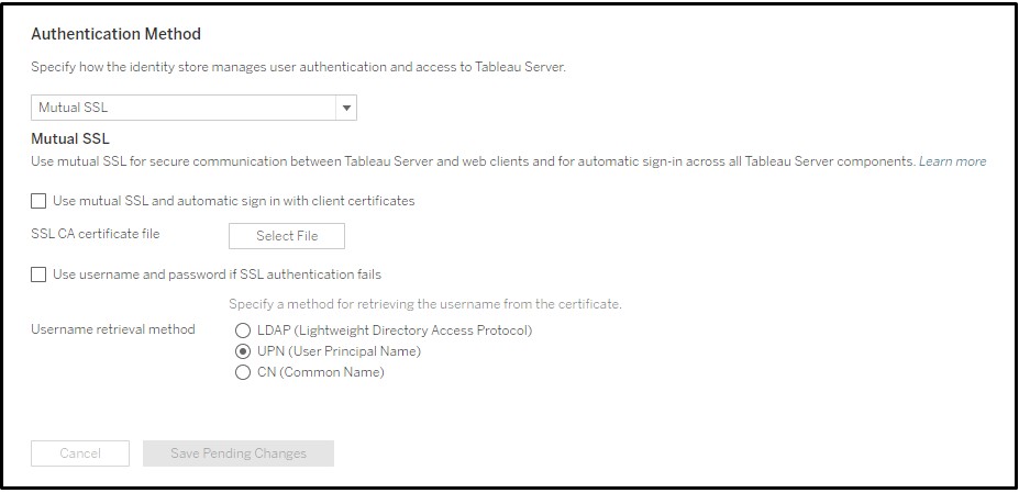 - Mutual SSL (тільки для Tableau Server). Даний метод надає користувачам прямий і безпечний доступ до Tableau Server. Сервер перевіряє наявність сертифікату і перевіряє автентичність користувача на основі імені в сертифікаті клієнта. Ви так само можете налаштувати вхід за логіном і паролем в разі збою SSL аутентифікації.