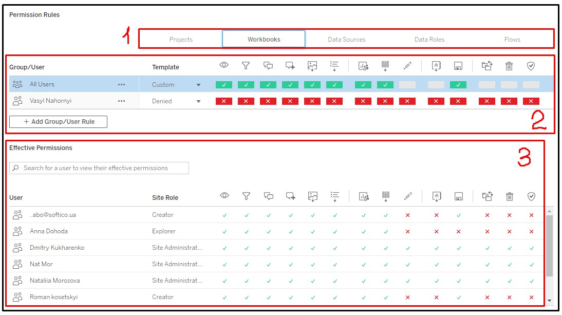 Біля потрібного типу контенту (Projects, Workbooks, Data Sources, Data Roles, Flows) знайти значок «. . . » > Permissions
