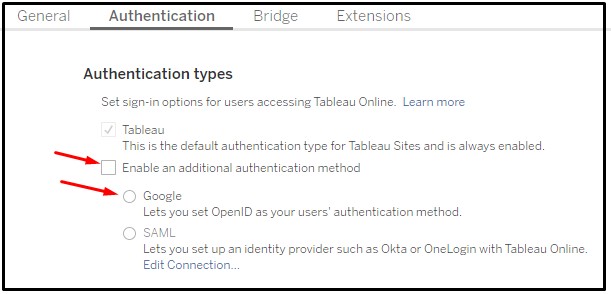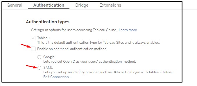 - для Tableau Online увійдіть в Tableau Online під Site Administrator і перейдіть в Settings> Authentication