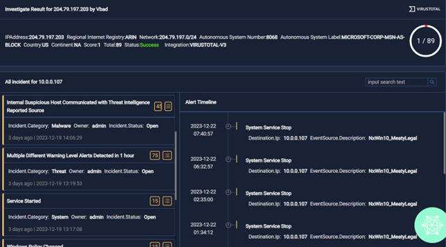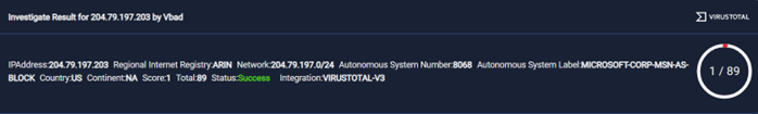 На попередніх зображеннях також була показана дія реагування. Тут була виконана дія перевірки ІР адреси зі списку Threat Intelligence. Як показав інтегрований VirusTotal, ця ІР адреса маркується лише одним джерелом як шкідлива, тому можна зробити висновок, що з більшою вірогідністю ця ІР адреса є не шкідливою і скоріше за все використовується у сервісі Microsoft.