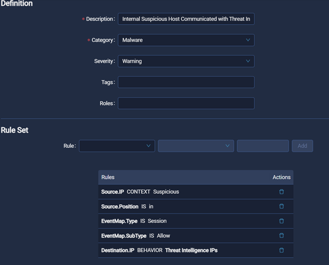 Інше правило кореляції працює одночасно по локальному списку і по списку сервісу Threat Intelligence. У цьому випадку кінцева точка 10.0.0.107 знаходилася в списку з контекстом Suspicious. Коли вона встановлює зв’язок із хостом зі списків Threat Intelligence, то генерується інцидент.