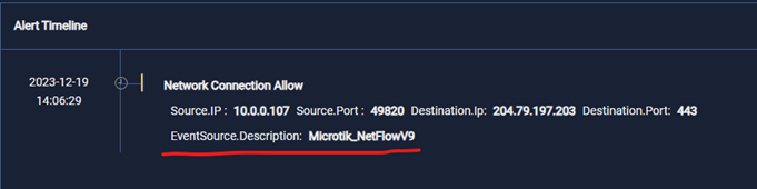 Також слід зауважити, що подія, яка згенерувала інцидент була отримана з іншого джерела – роутера що інтегрований методом NetFlow. По цьому методу інформація про потік даних що проходить через роутер надходить до сервера Logsign на аналіз.