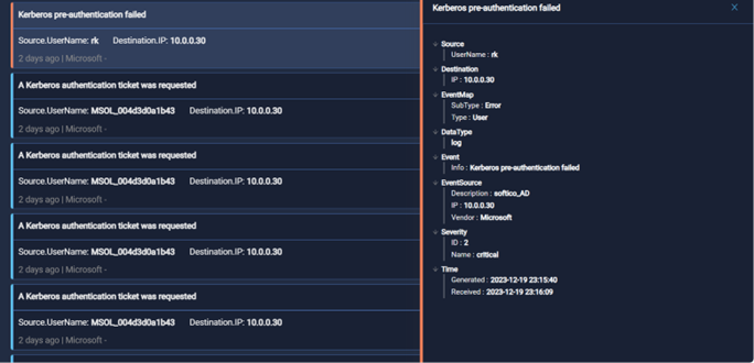 Також Logsign здатен відслідковувати події сервісів Windows. Сервісів у віндовс сервері може бути досить багато. Як приклад можна навести події Kerberos – протоколу підтвердження користувача або вузла.