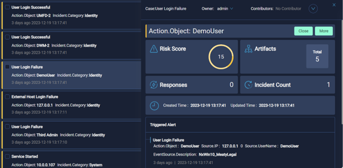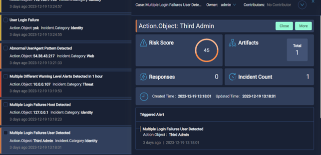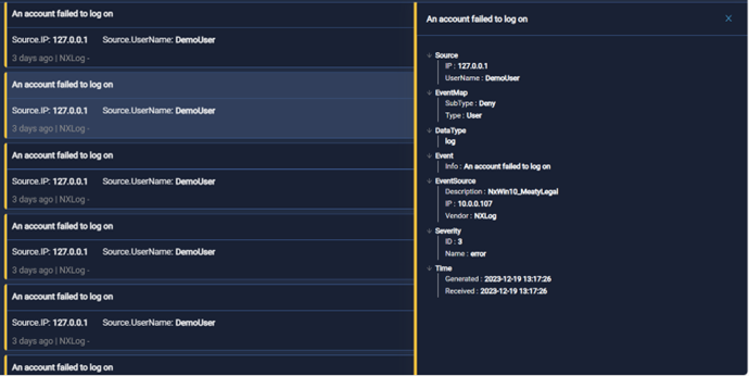 Для прикладу обробки подій розглянемо вже знайомі події входу в систему. У випадку коли вхід до системи був невдалий, тобто користувач вказав неправильний логін чи пароль, Logsign отримає цю подію і згенерує інцидент, надавши йому оцінку, згрупувавши в ньому всі пов’язані події, та відобразивши основну інформацію у короткому відображенні.