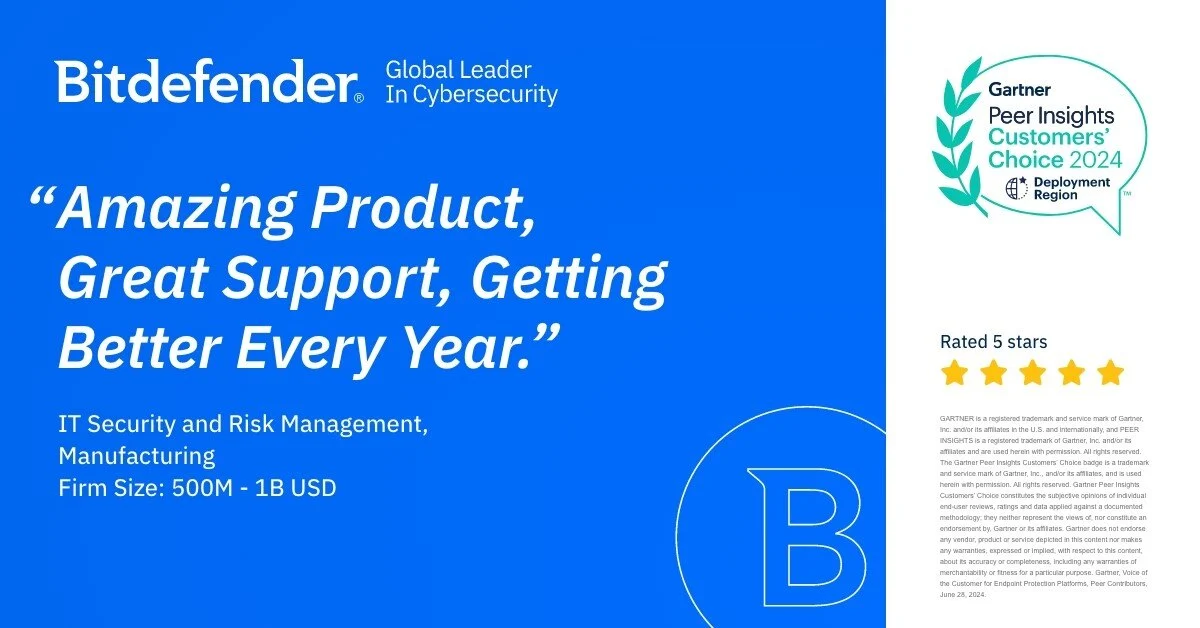 З радістю повідомляємо, що компанія Bitdefender була визнана вибором клієнтів у регіоні EMEA у звіті Gartner Peer Insights Voice of the Customer за 2024 рік. Також компанію відзначили як сильного виконавця за загальними оцінками платформ захисту кінцевих точок (EPP) та в секторах державних установ, урядів та освіти.