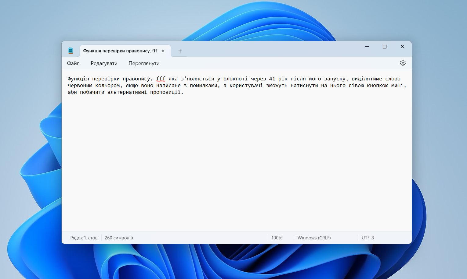 Тепер у Блокноті з’явилася функція перевірки правопису, яка виокремлює слова з помилками червоним кольором. Користувачі можуть клацнути правою кнопкою миші на такі слова, щоб побачити альтернативні пропозиції. Проте оновлення поки недоступне для української мови.
