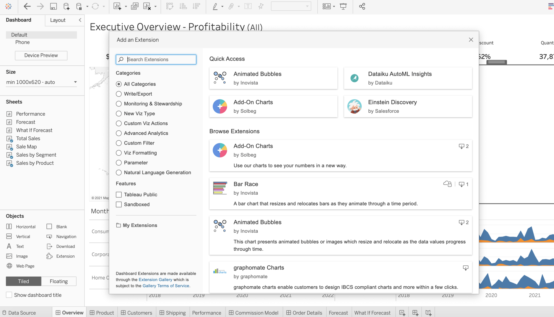 Вікно в інтерфейсі Tableau, що відображає вбудовану галерею розширень